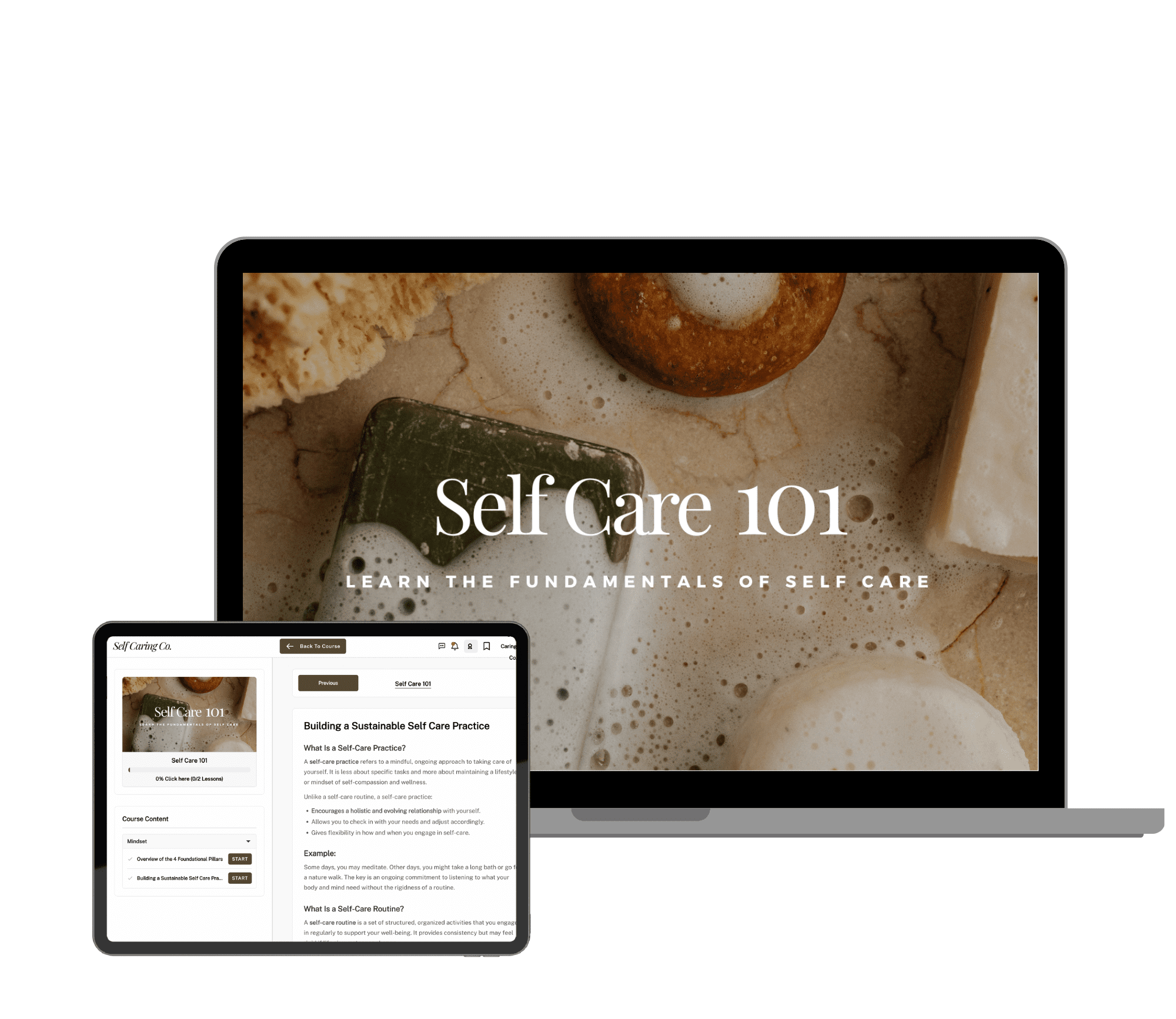 Your membership includes three signature courses designed to help you reconnect with yourself, build sustainable habits, and create a self care practice that feels true to you. Each one builds on the next, guiding you from awareness to action to mastery.